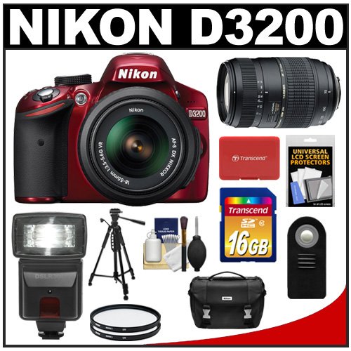 | Nikon D3200 Digital SLR Camera & 18-55mm G VR DX AF-S Zoom Lens (Red) with 70-300mm Lens + 16GB Card + Flash + Case + Filters + Remote + Tripod + Accessory Kit |
